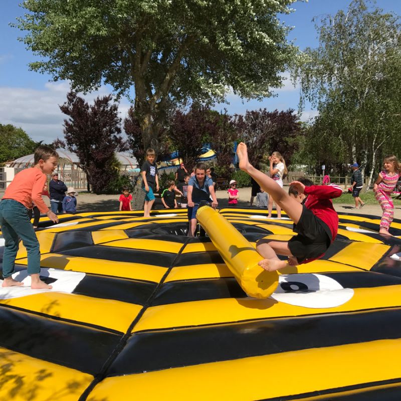 Plus tu pédales, plus la balayette tourne vite et fauche tes amis placé sur le coussin de 9m de diamiètre !